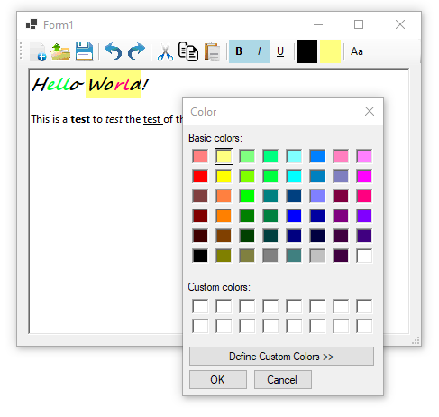 When you run the above example and click type into the RichTextBox control, and click on the ToolStrip Button's, then you should see something similar to the following: