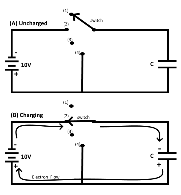 In figure (A), an uncharged capacitor is shown connected to a four-position switch. With the switch in position 1 the circuit is open and no voltage is applied to the capacitor. Initially each plate of the capacitor is a neutral body and until a difference of potential is impressed across the capacitor, no electrostatic field exists between the plates.