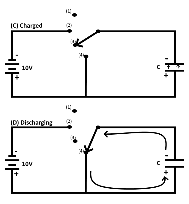 To DISCHARGE the capacitor, the charges on the two plates must be neutralized. This is accomplished by providing a conducting path between the two plates (as shown in the figure (D) above). With the switch in position 4 the excess electrons on the negative plate can flow to the positive plate and neutralize its charge. When the capacitor is discharged, the distorted orbits of the electrons in the dielectric return to their normal positions and the stored energy is returned to the circuit.