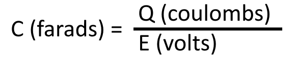 Capacitance, which is the amount of energy that can be stored by a capacitor, is measured in units called FARADS. A one-farad capacitor stores 1 coulomb (a unit of charge (Q) equal to 6.28 x 1018 electrons) of charge when a potential of 1 volt is applied across the terminal of the capacitor, and can be expressed by the formula: