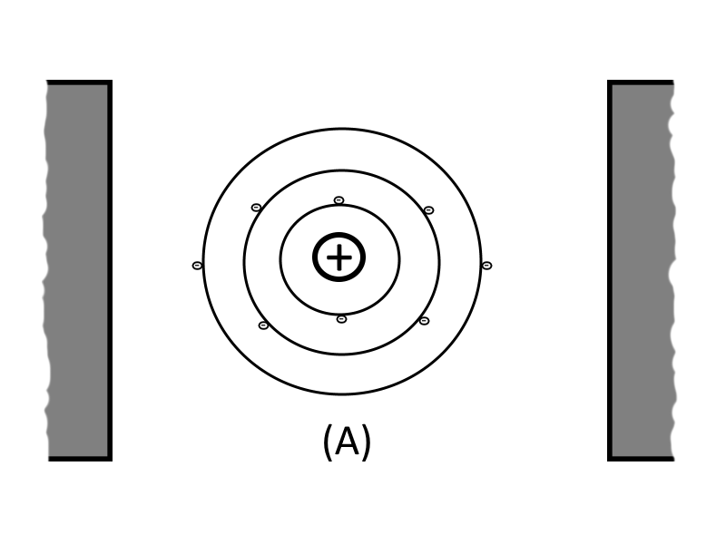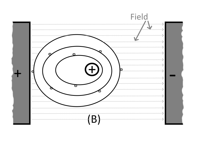 In the figure below, Part A shows the electrons normal orbits around an atoms proton, for an atom that is suspended between two uncharged bodies (i.e. the uncharged plates of a capacitor):