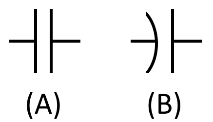 The curved plate in symbol (B) of the figure indicates that plate should be connected to a negative polarity. However if both plates are flat, as in symbol (A) of the figure, then it is OK to connect a negative polarity to either of the two plates.